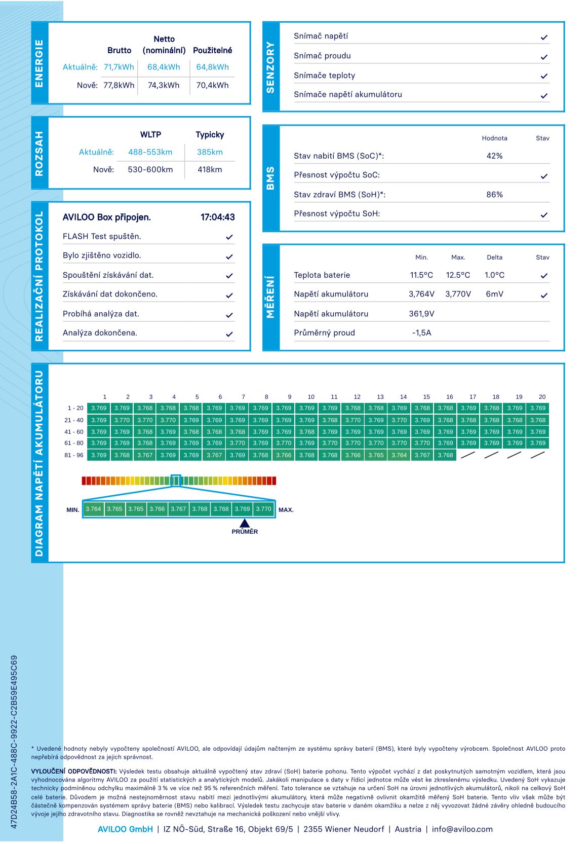 Proveden test baterie Aviloo – SOH 92,1%, rozdíl napětí na článcích 6 mV