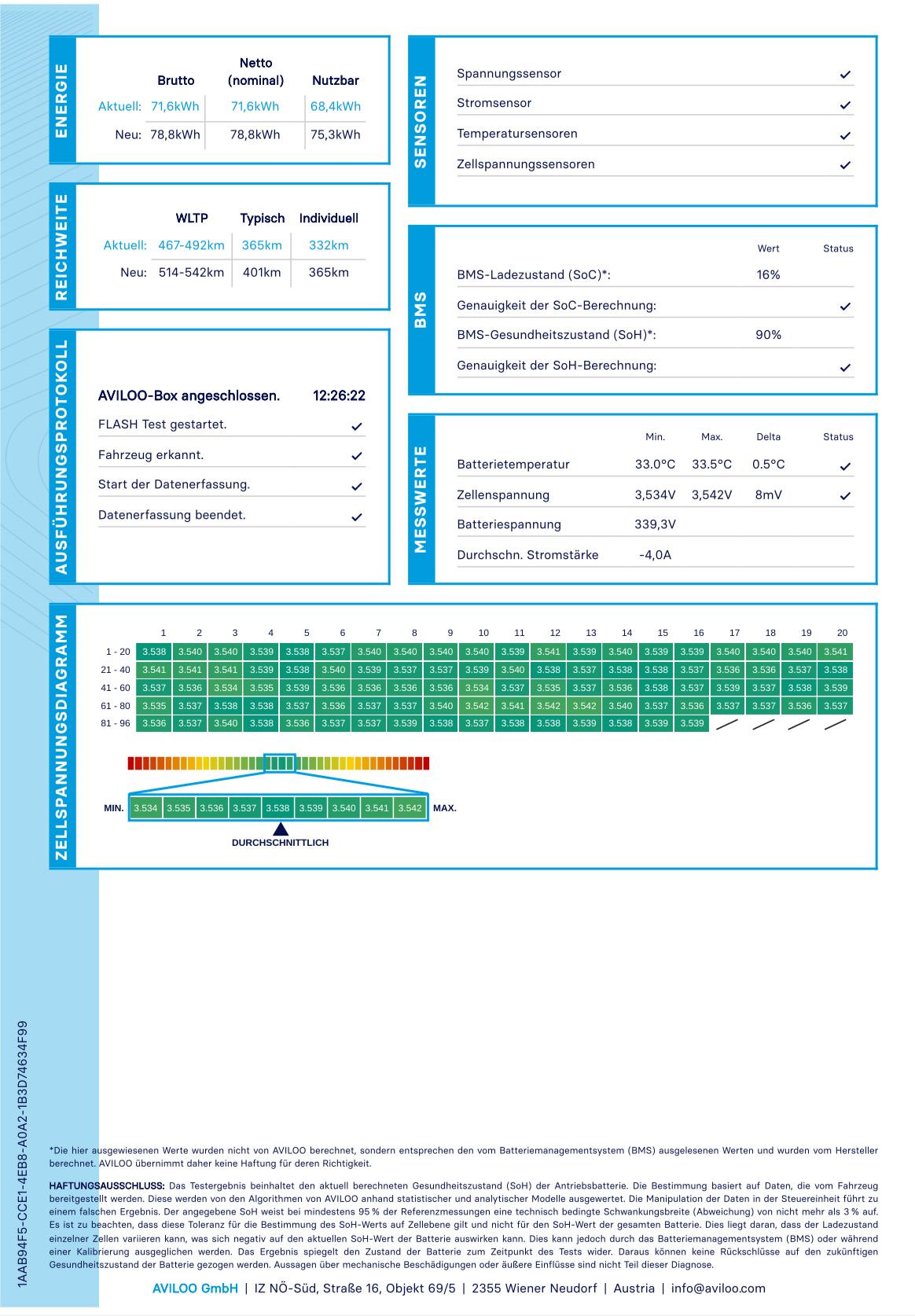 Test baterie Aviloo: SOH 90,9 %, rozdíl napětí mezi články: 8 mV